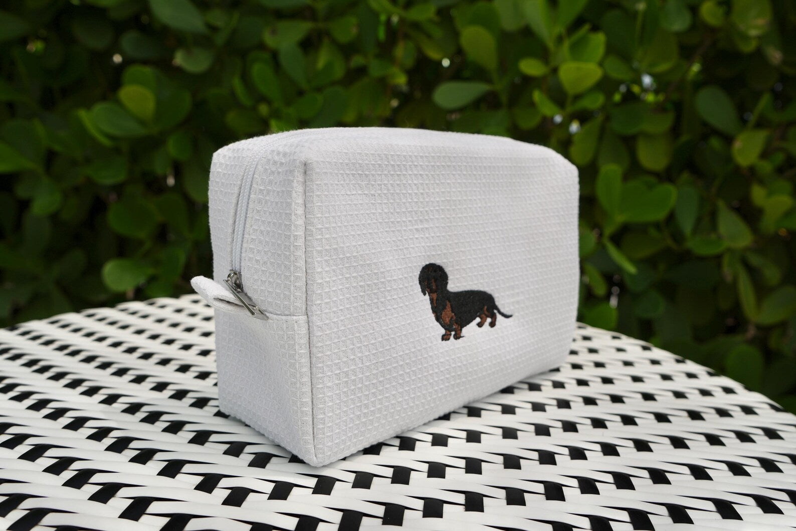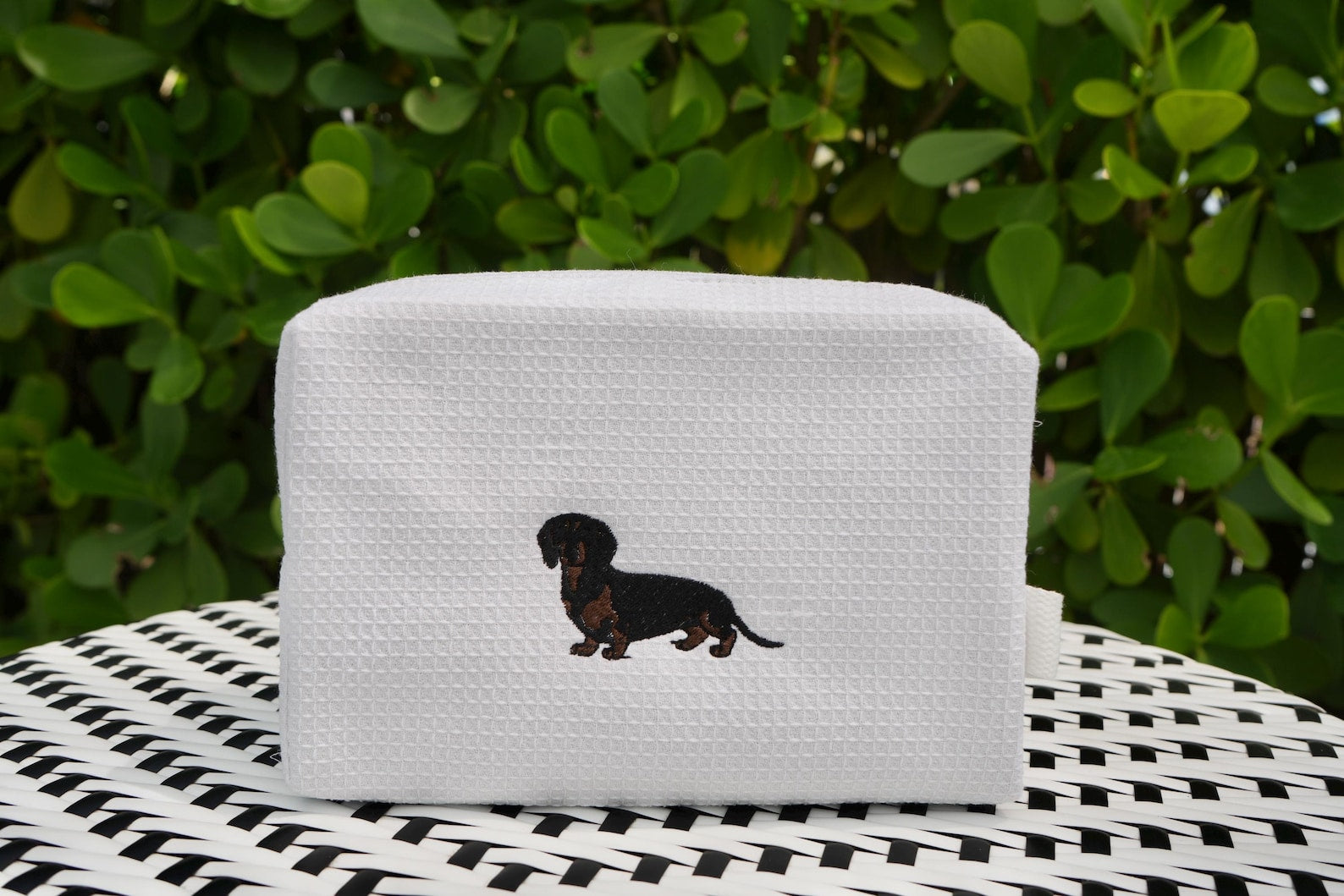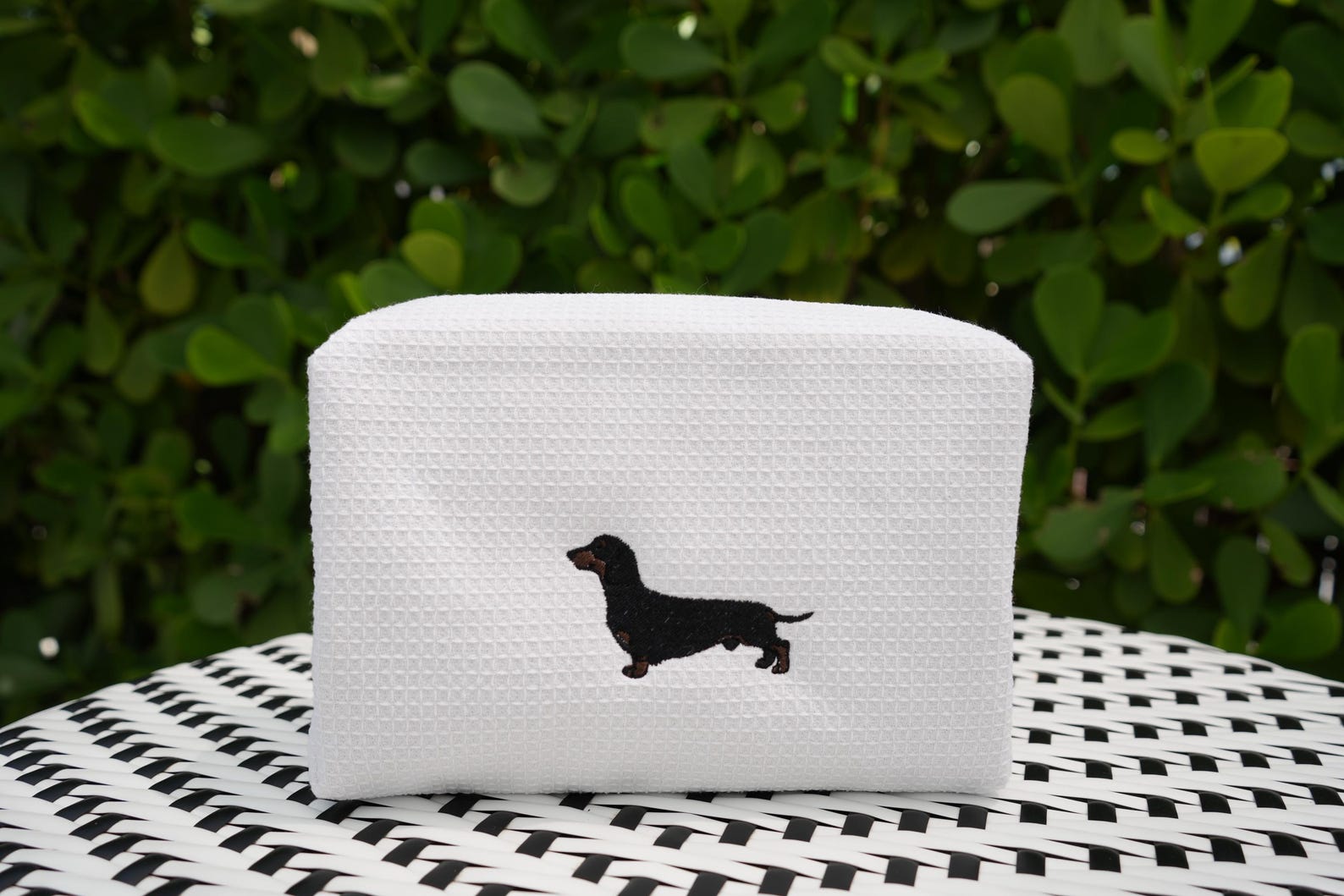 For the dachshund lovers who carry their love for their pup everywhere — this embroidered pouch is for you. Thoughtfully designed and stitched with care, this cosmetic pouch features a charming dachshund motif on a textured white waffle fabric. Whether you use it as a travel bag or makeup pouch, it’s a chic and playful way to keep your essentials in one place.