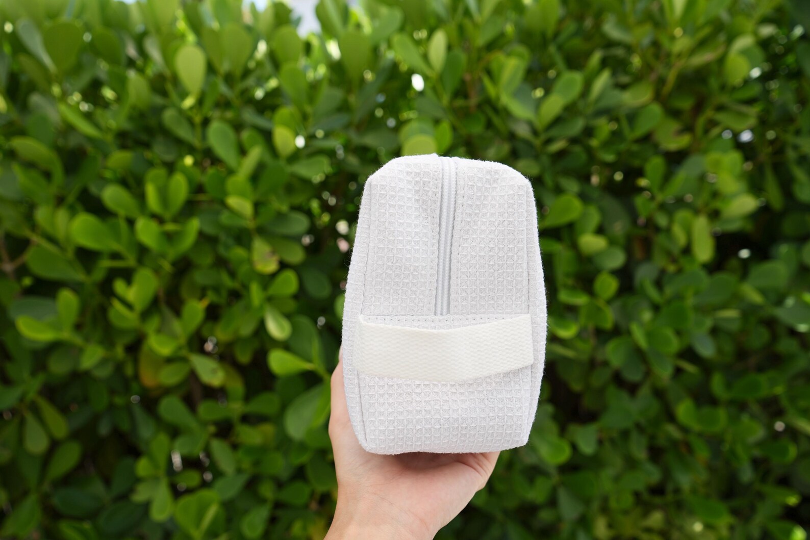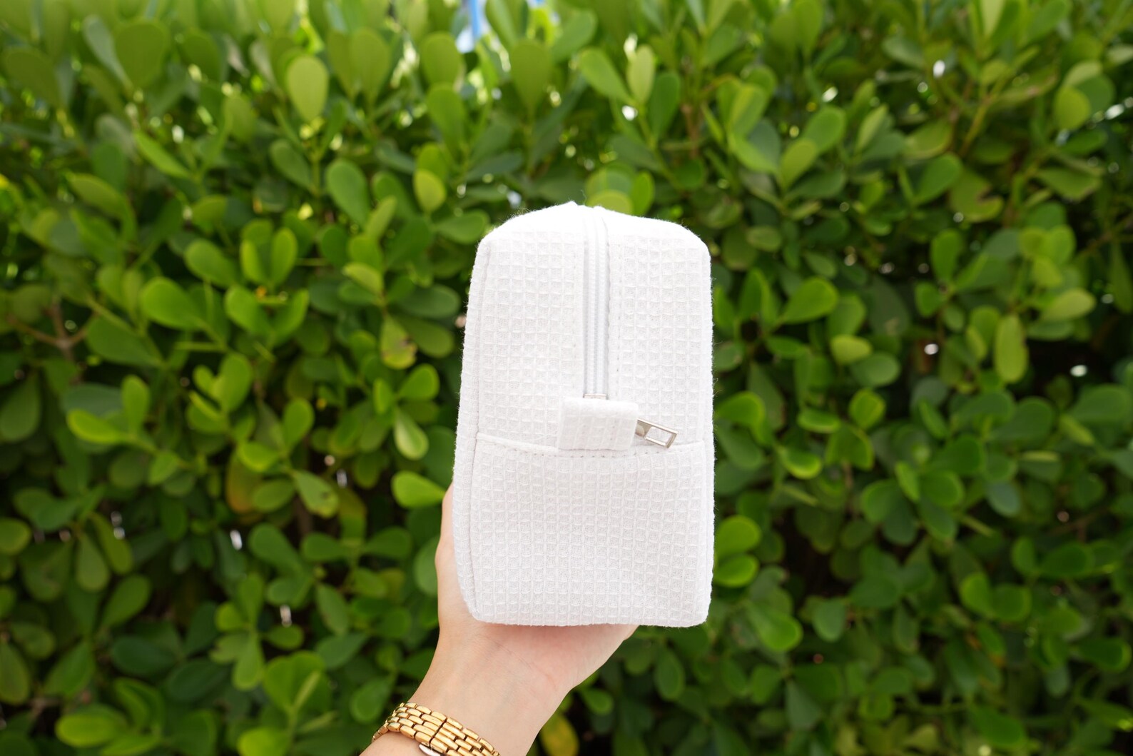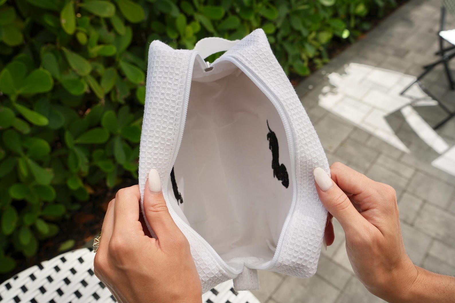 For the dachshund lovers who carry their love for their pup everywhere — this embroidered pouch is for you. Thoughtfully designed and stitched with care, this cosmetic pouch features a charming dachshund motif on a textured white waffle fabric. Whether you use it as a travel bag or makeup pouch, it’s a chic and playful way to keep your essentials in one place.