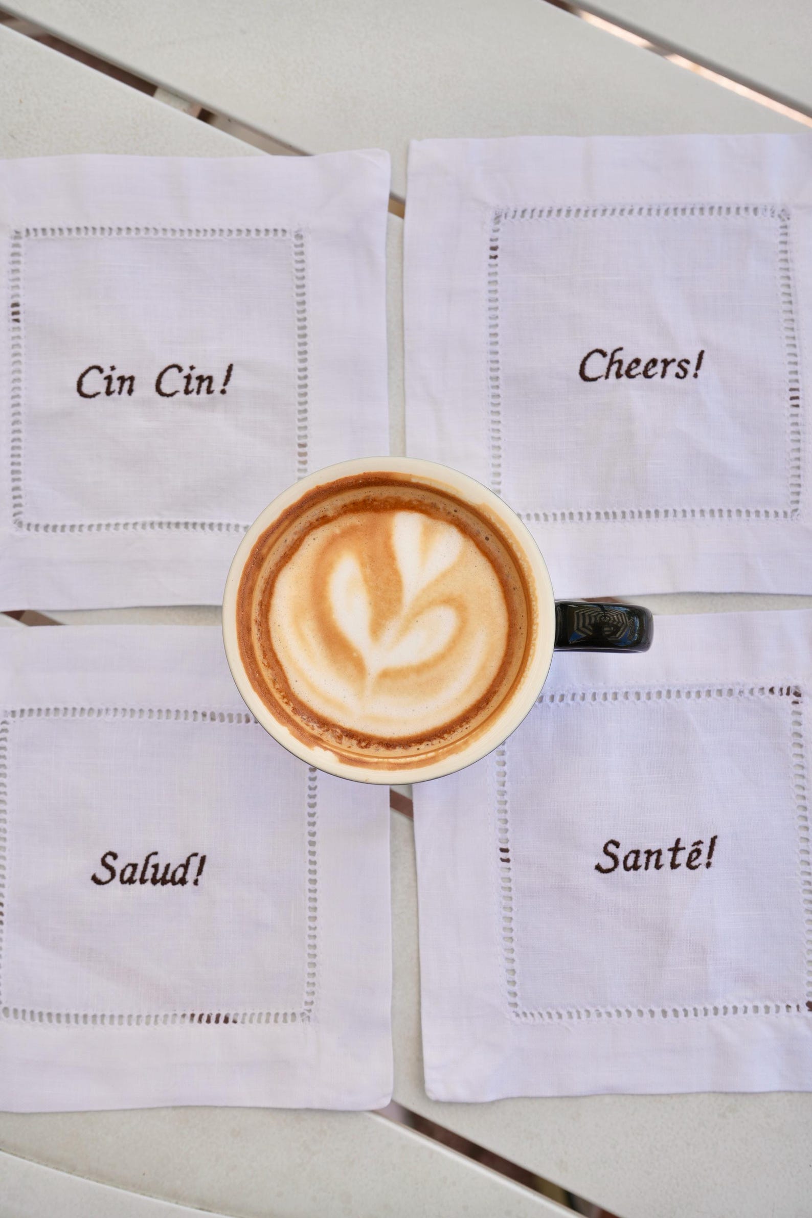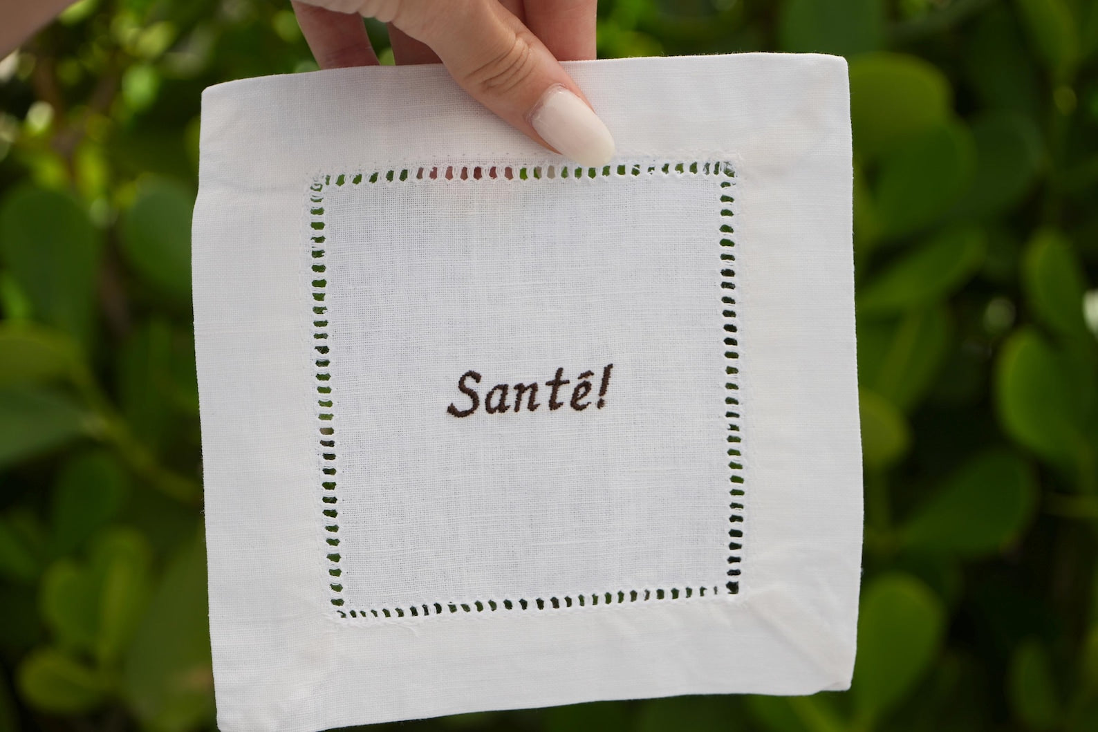 Embroidered Cocktail Napkins: Cheers, Salud, Cin Cin, Santé, Set of 4