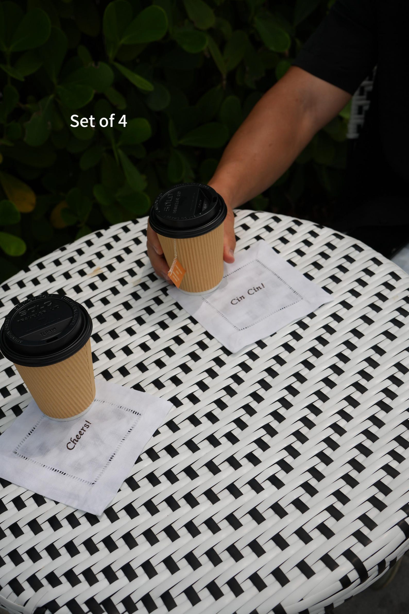 Celebrate in every language with these festive embroidered cocktail napkins featuring the words Cheers, Cin Cin, Salud, and Santé! A perfect nod to global toasts and good times, these napkins add a playful and sophisticated touch to any gathering.