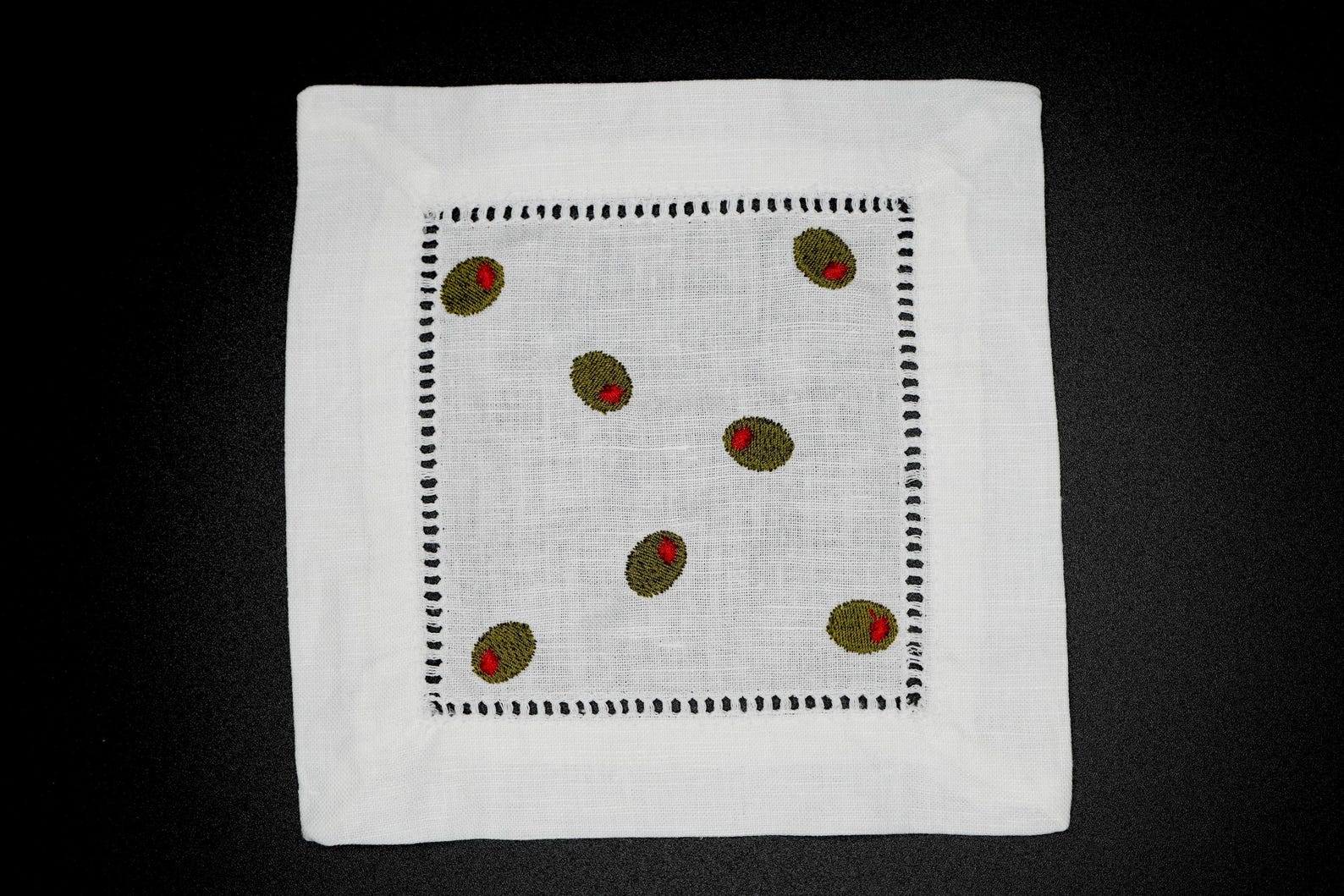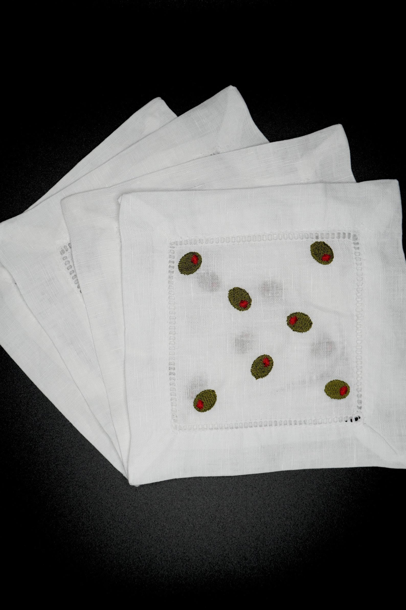 Add a sophisticated twist to your summer entertaining with these elegant olive-embroidered cocktail napkins. Featuring beautifully stitched green olives on premium linen fabric, these napkins bring a subtle, stylish touch to any gathering.