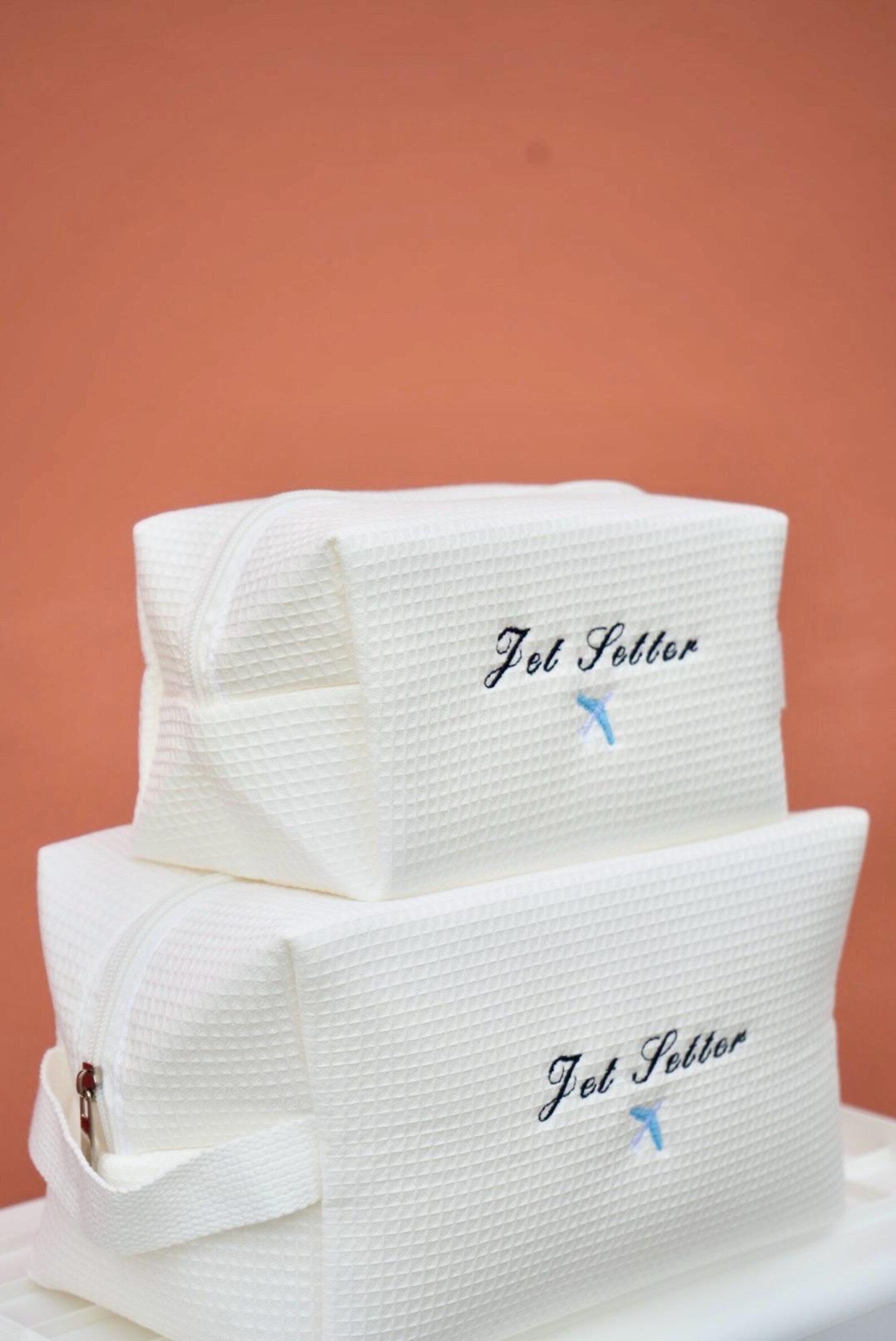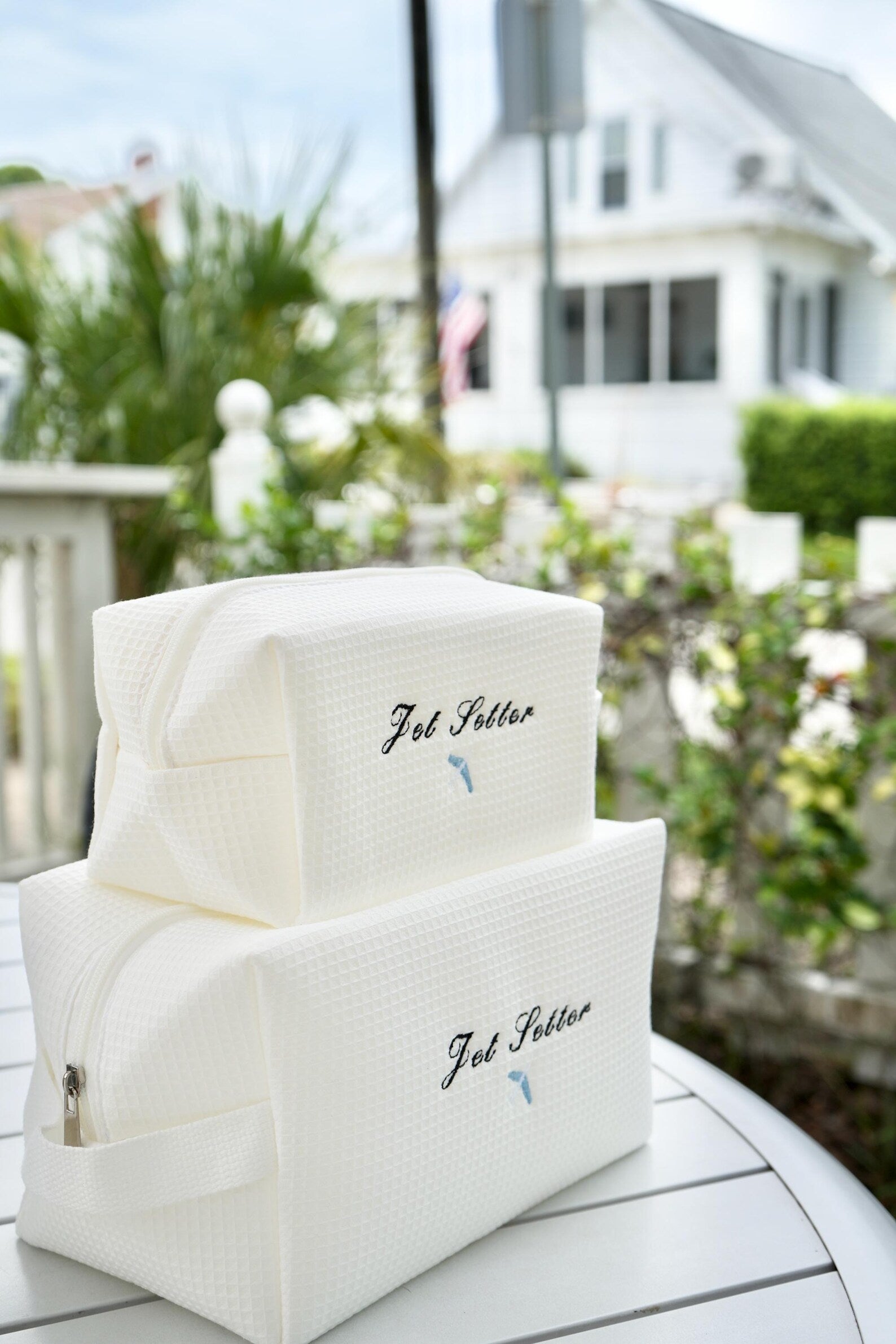 Whether you’re hopping on a plane or dreaming of your next escape, this cotton waffle cosmetic bag is made for the modern-day jet setter. Embroidered with the words “Jet Setter” and a charming little jet, it’s the perfect travel companion to keep your essentials organized in style.